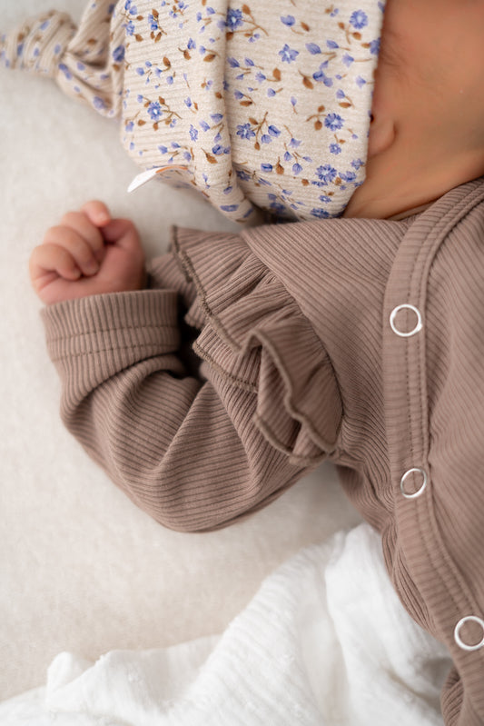 Newborn set Mini bloemen perzik (rib) broek + muts
