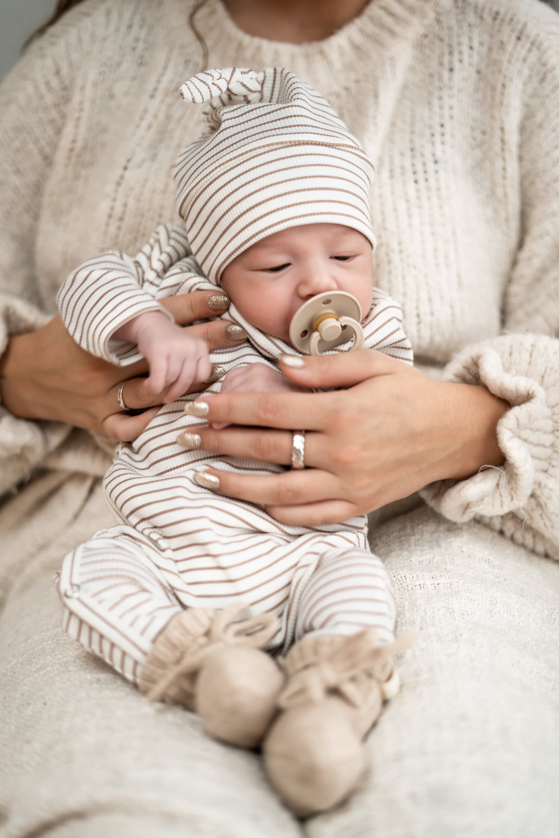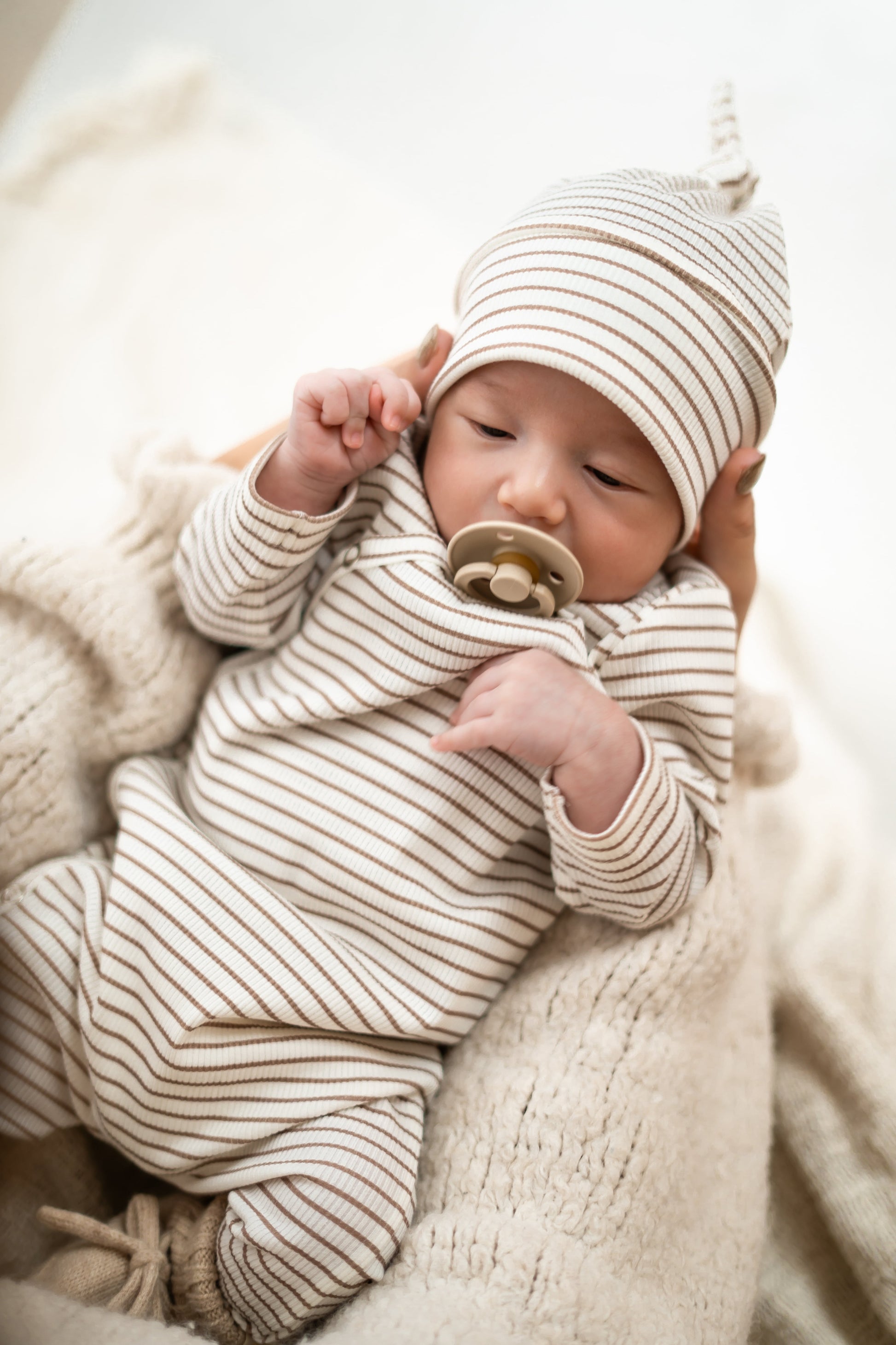 Ben je op zoek naar een stijlvol boxpakje voor jongens of meisjes? Dit prachtige rib boxpakje combineert een ecru ondergrond met elegante taupekleurige streepjes en is gemaakt van zachte, rekbare ribstof voor optimaal comfort. Dankzij de handige drukknoopjes is dit geboortepakje niet alleen mooi, maar ook praktisch. Een perfecte keuze voor je pasgeboren baby!