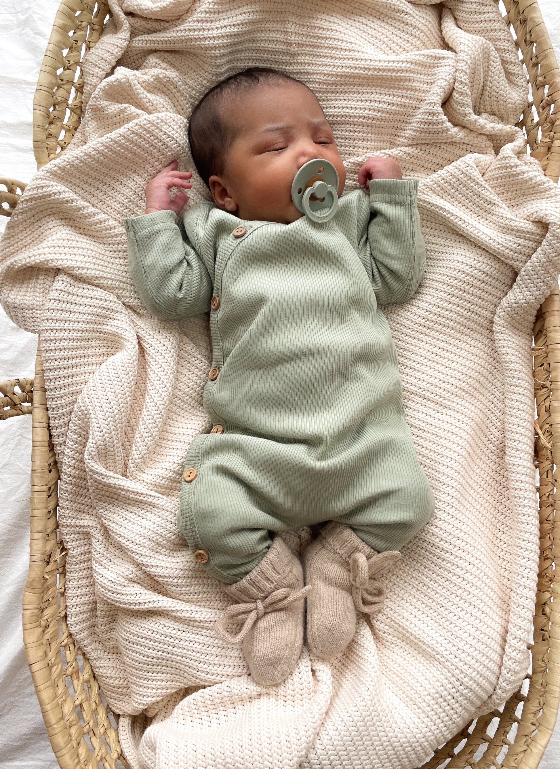 Geef je baby een zachte en comfortabele start met dit lichtgroene rib boxpakje met houten knoopjes. Een prachtige aanvulling op jouw babyuitzet!