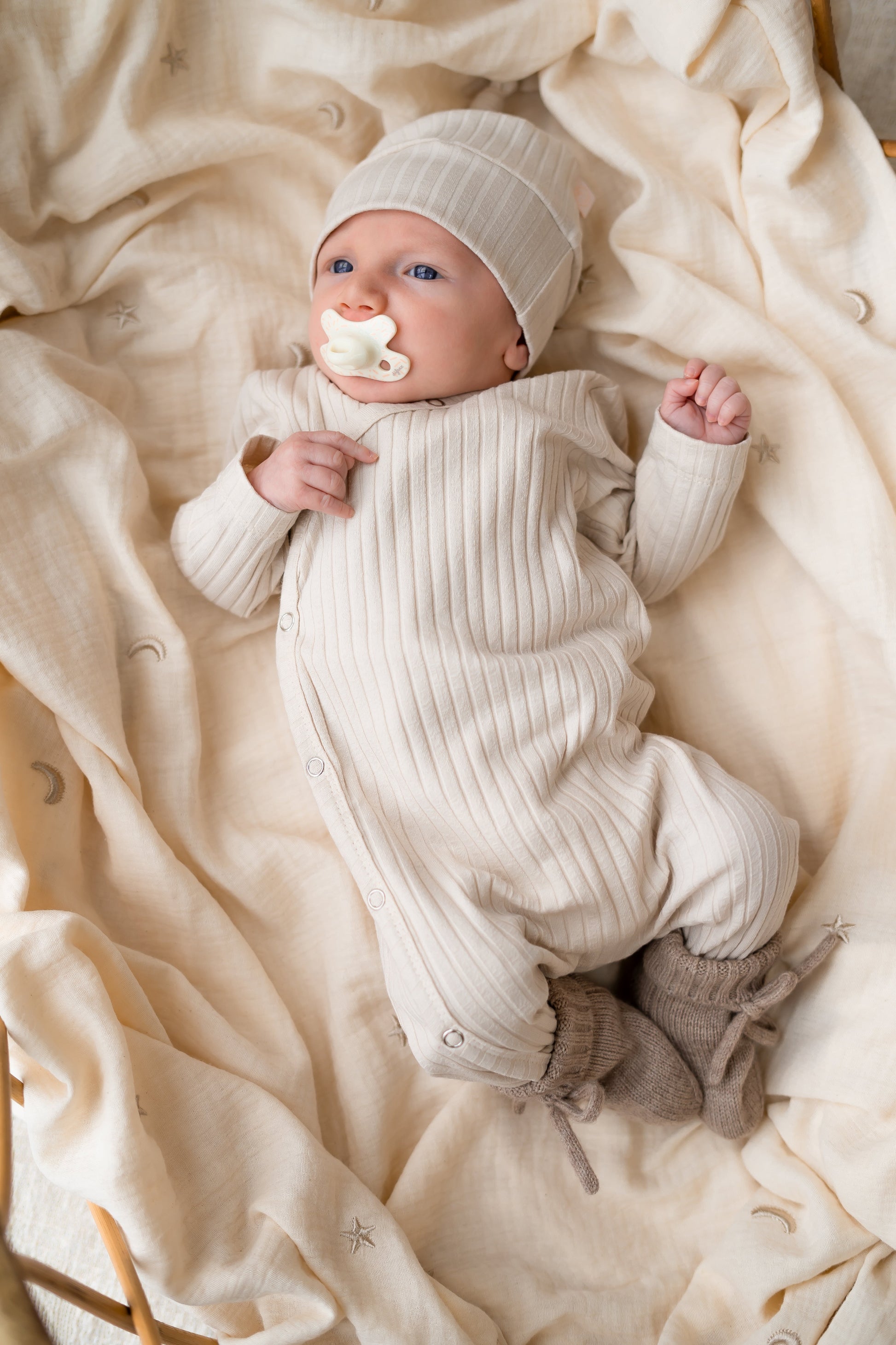 • Zacht & huidvriendelijk – De brede ribstof is rekbaar en voelt heerlijk aan op de gevoelige babyhuid.