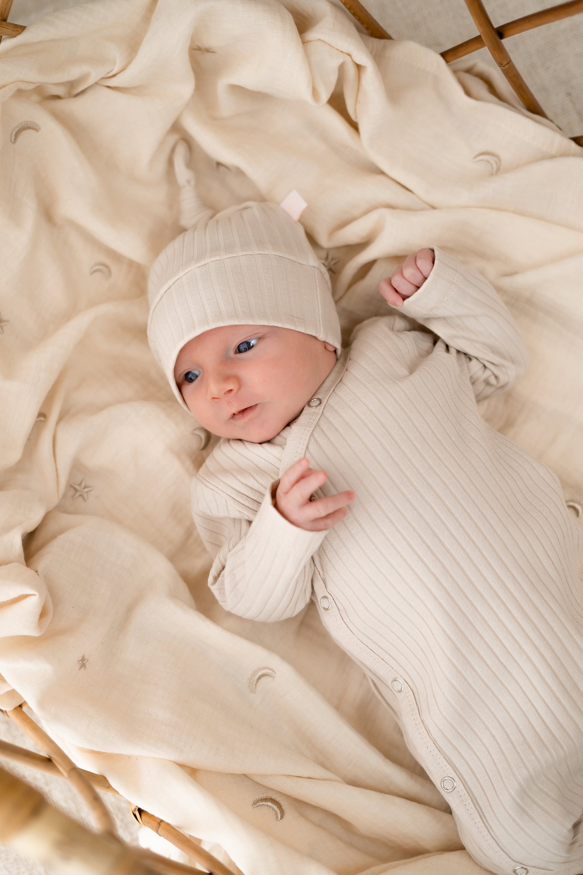 Geef je baby een zachte, comfortabele start met dit prachtige naturelkleurige boxpakje van brede ribstof – een echte must-have voor de eerste dagen!