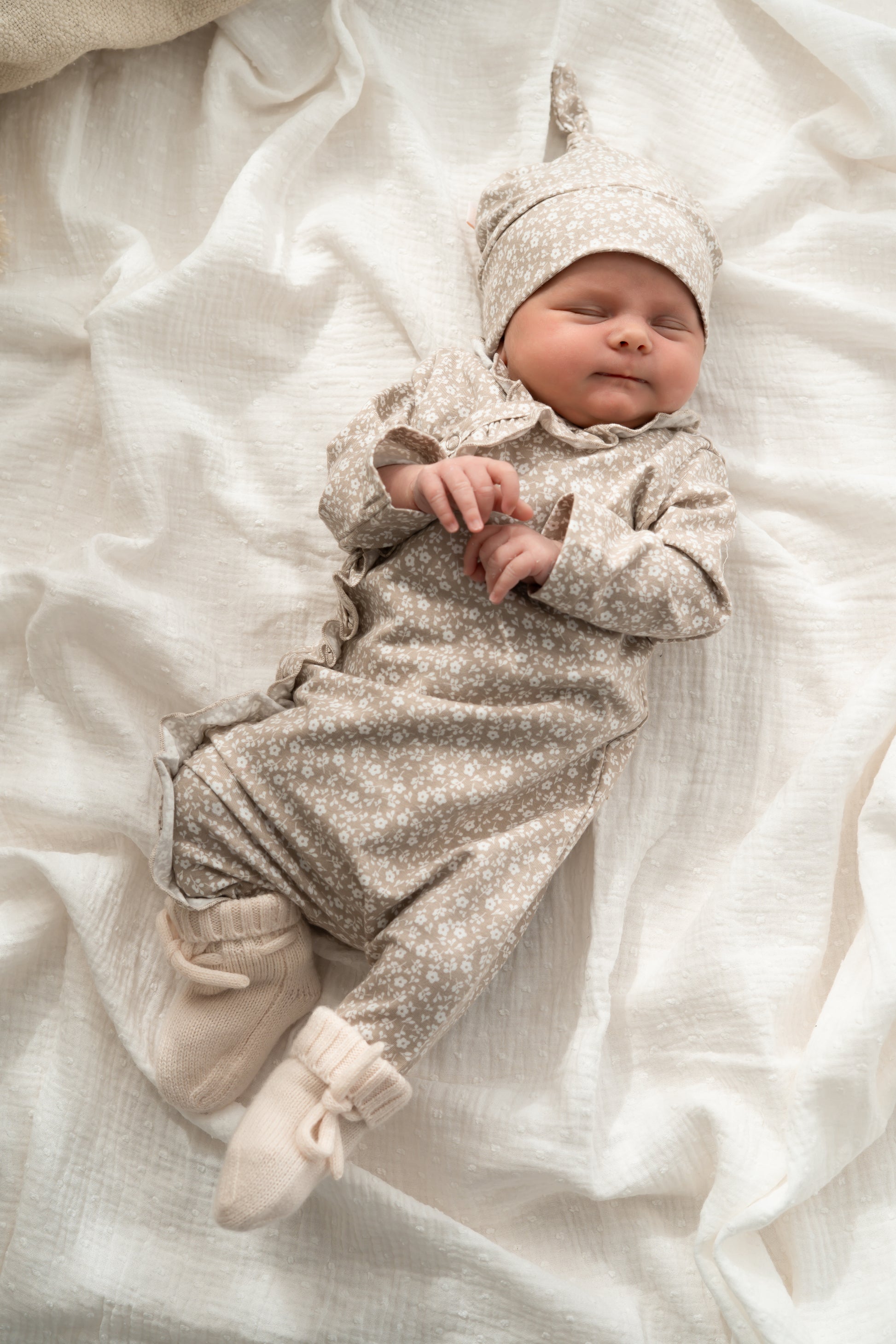 Combineer met een bijpassend taupe haarbandje of mutsje voor een lieve look. Voeg zachte babybooties van merinowol toe voor extra warmte tijdens de eerste weken.