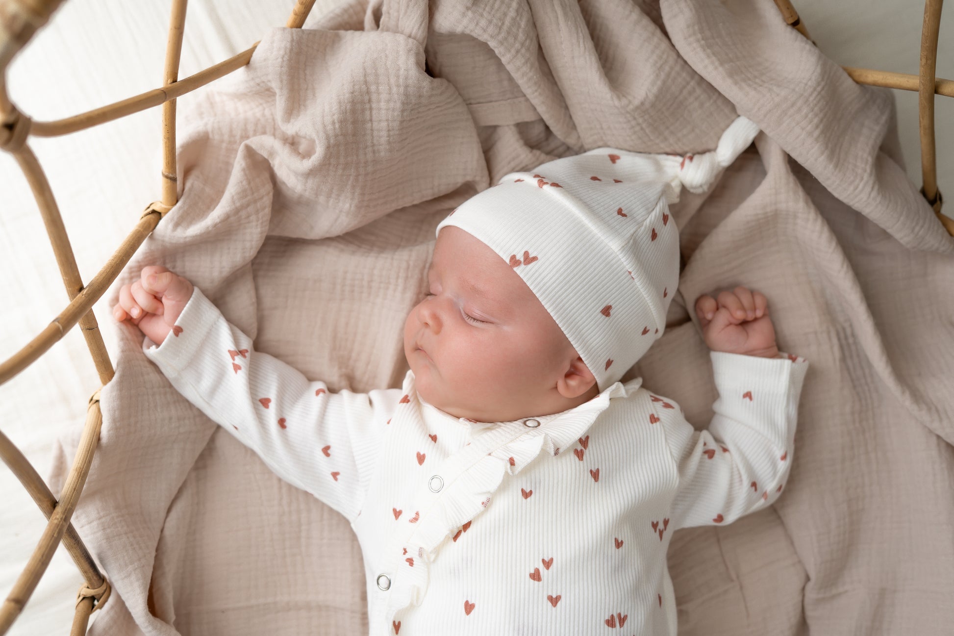 Geboortepakje met karakter: De zachte kleur en het hartjespatroon maken het perfect als eerste outfit.