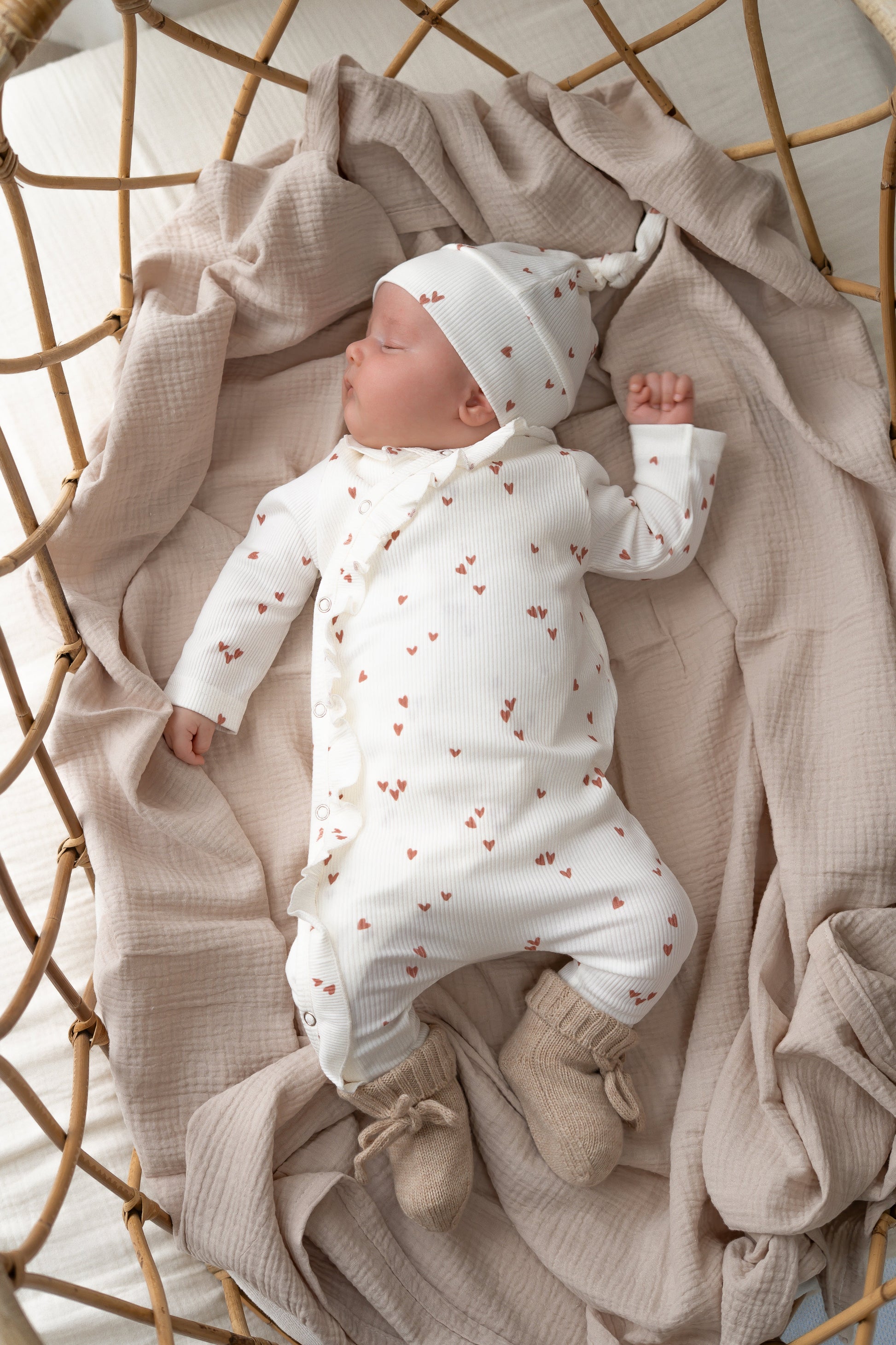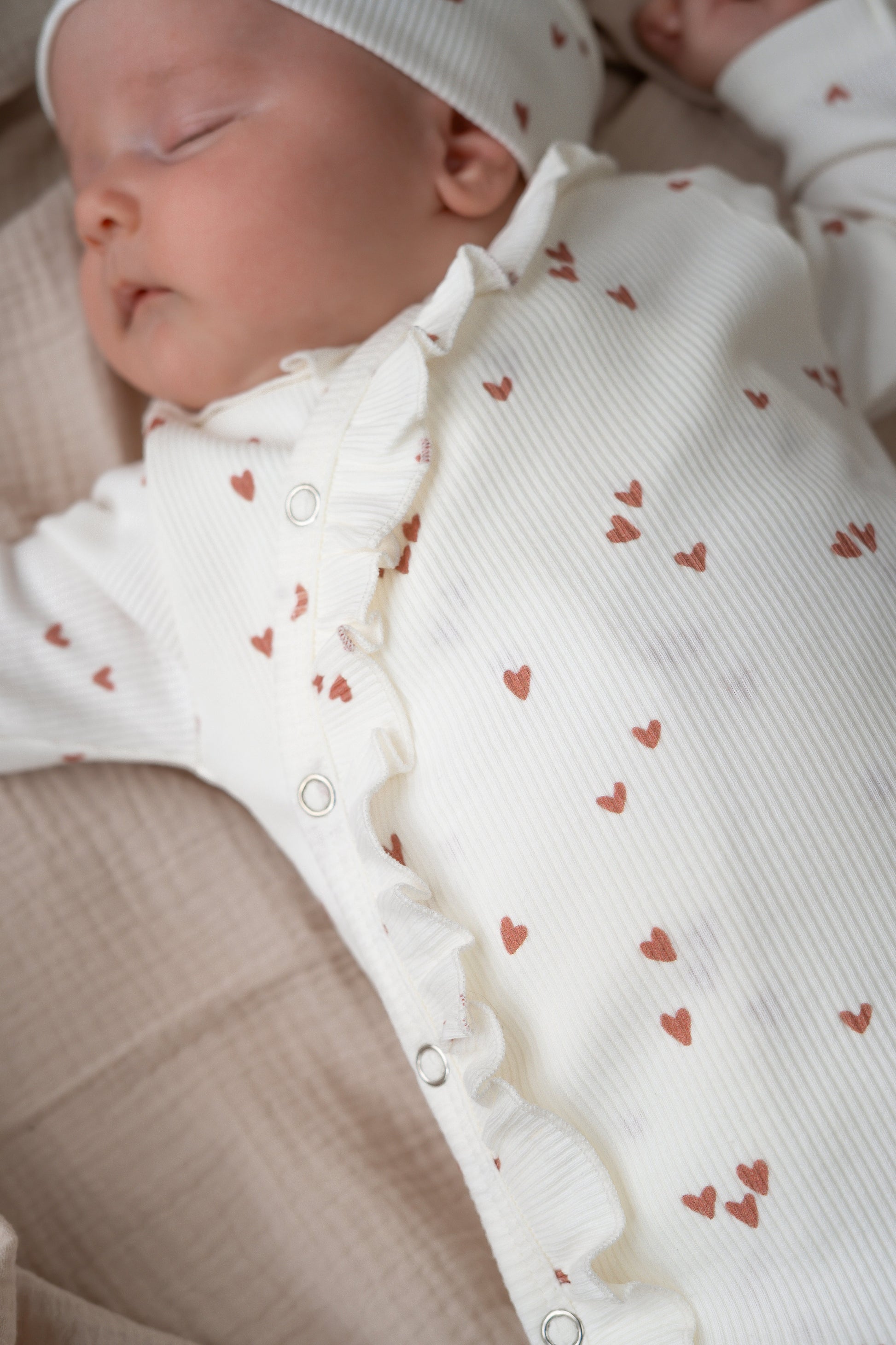 Breng warmte en stijl samen met dit meisjes boxpakje in een zachte klei roze tint, afgewerkt met lieve mini hartjes en elegante ruffles. De fijne ribstof voelt comfortabel aan en biedt net dat beetje extra stretch voor bewegingsvrijheid. De diagonale ruffles geven het pakje een speelse en verfijnde uitstraling – ideaal voor je pasgeboren meisje.