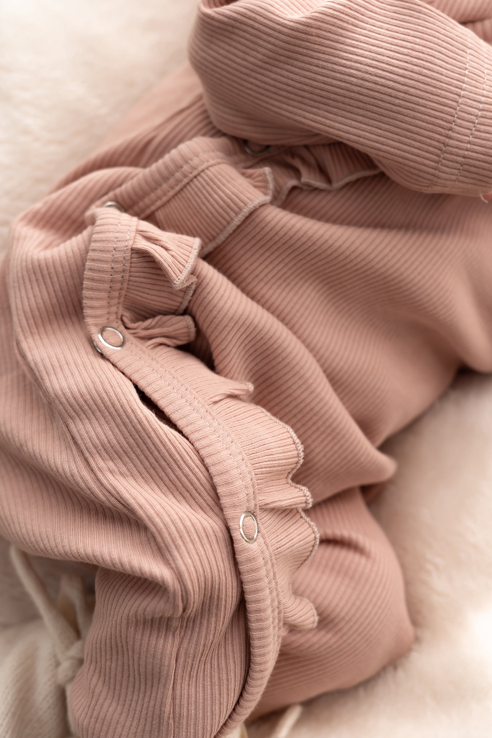 Lief en elegant: zachtroze meisjes boxpakje met ruffles van ribstof