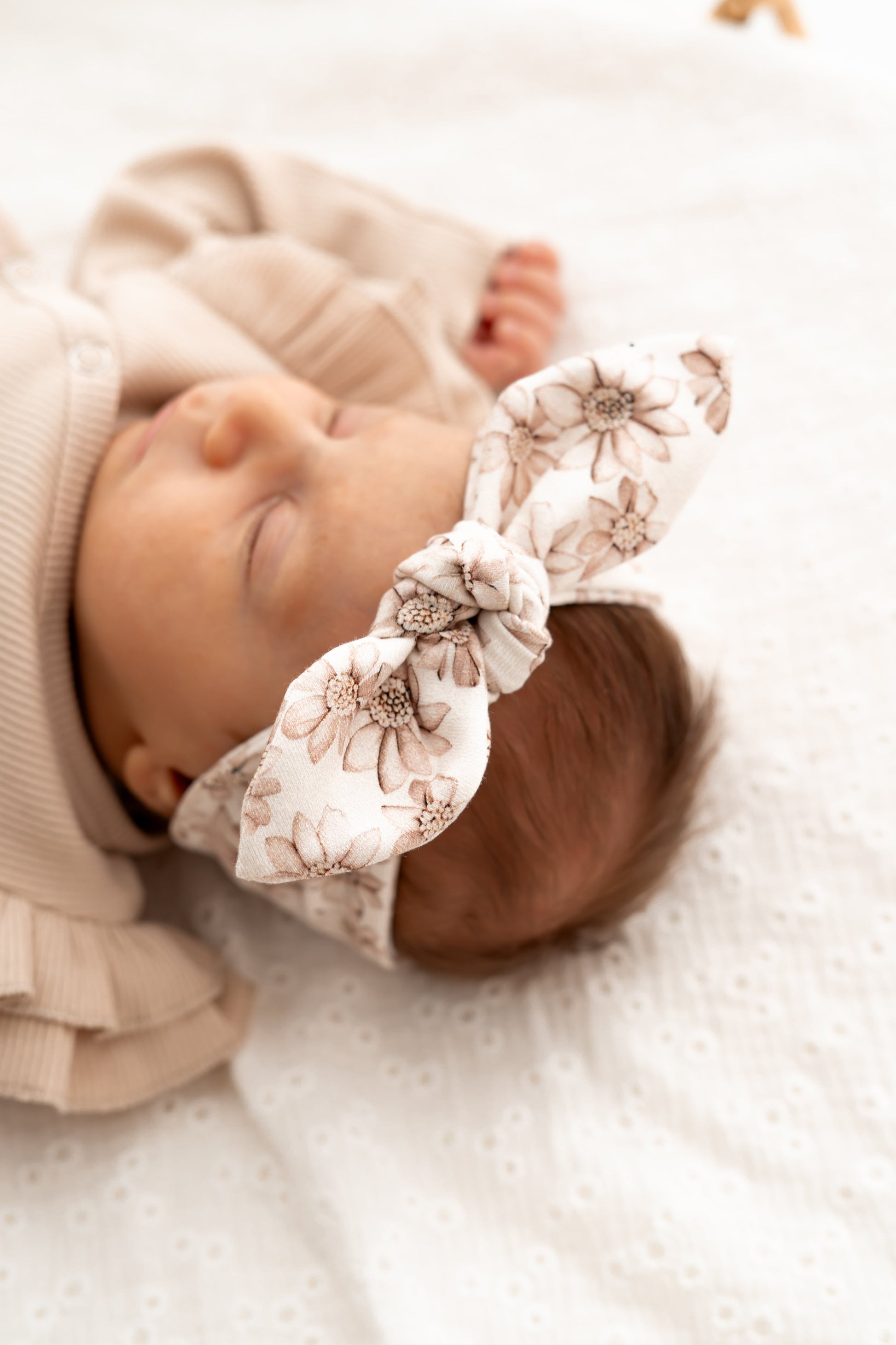 Knoophaarbandje Beige Bloemen – Zachte babyhaarband voor meisjes
