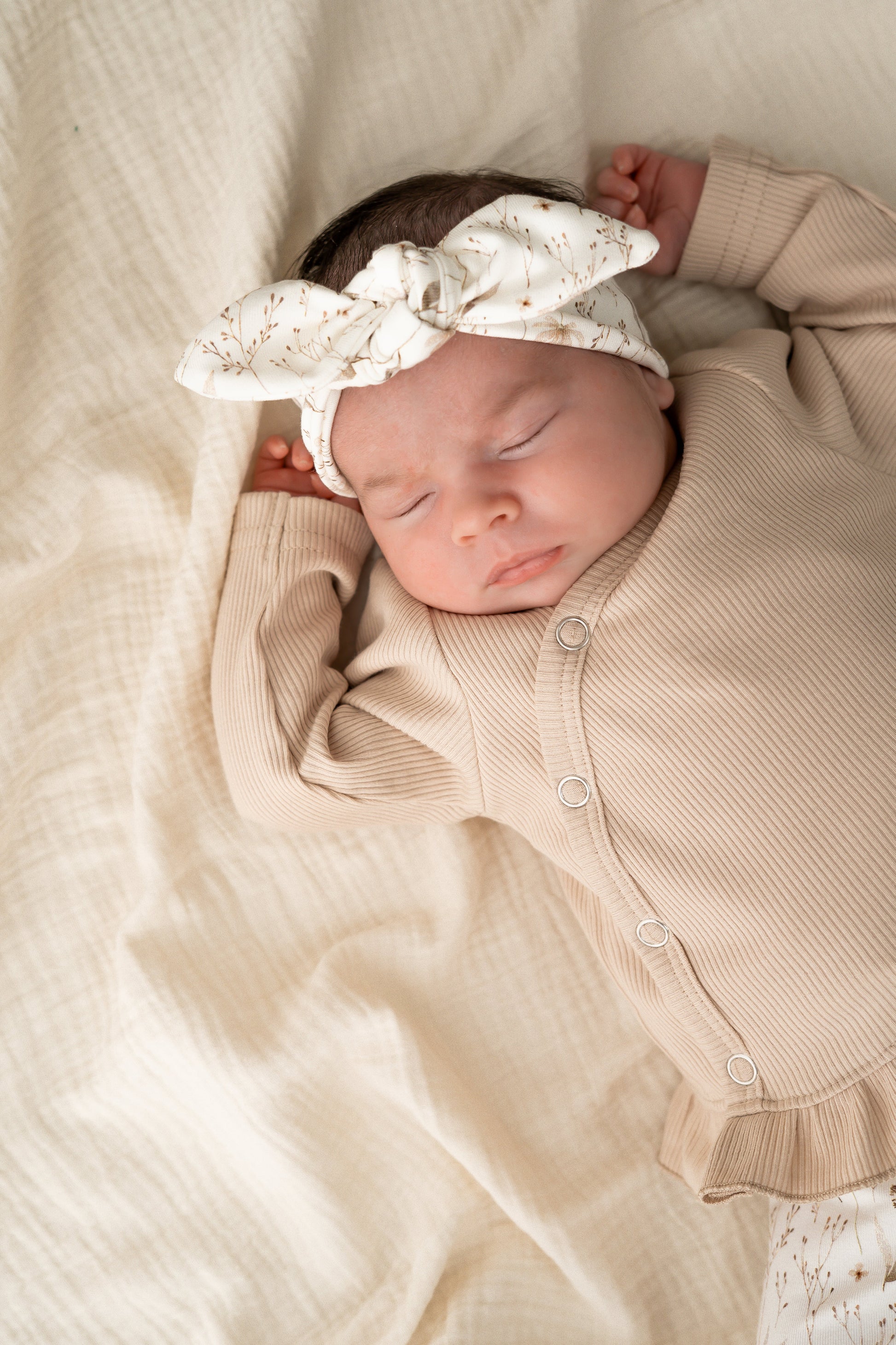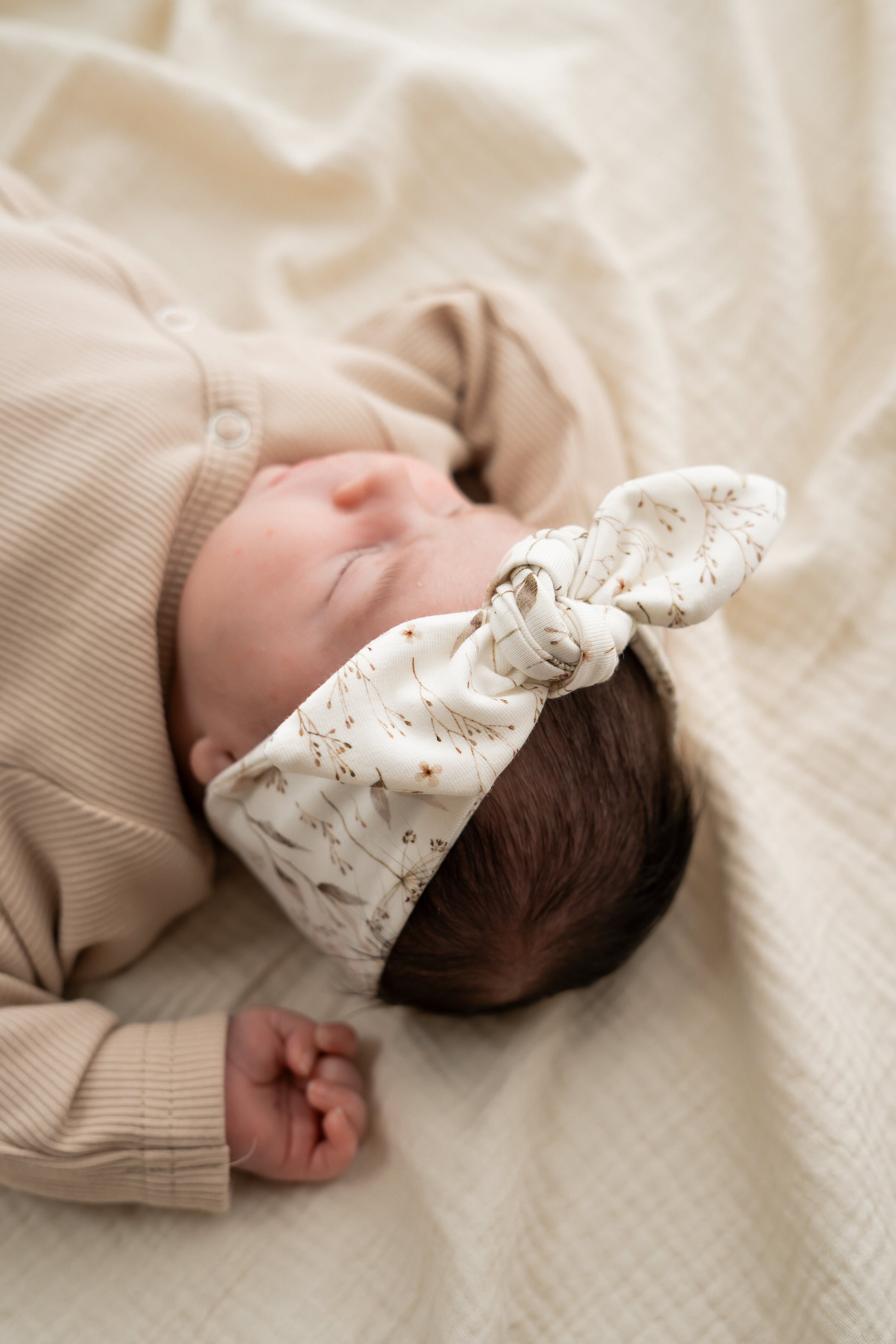 Dit lieve knoophaarbandje in een ecru kleur met verfijnde veldbloemenprint is een perfecte accessoire voor kleine meisjes. De soepele, rekbare stof en elegante knoop maken het haarbandje zowel comfortabel als modieus – ideaal voor elke dag én bijzondere momenten.