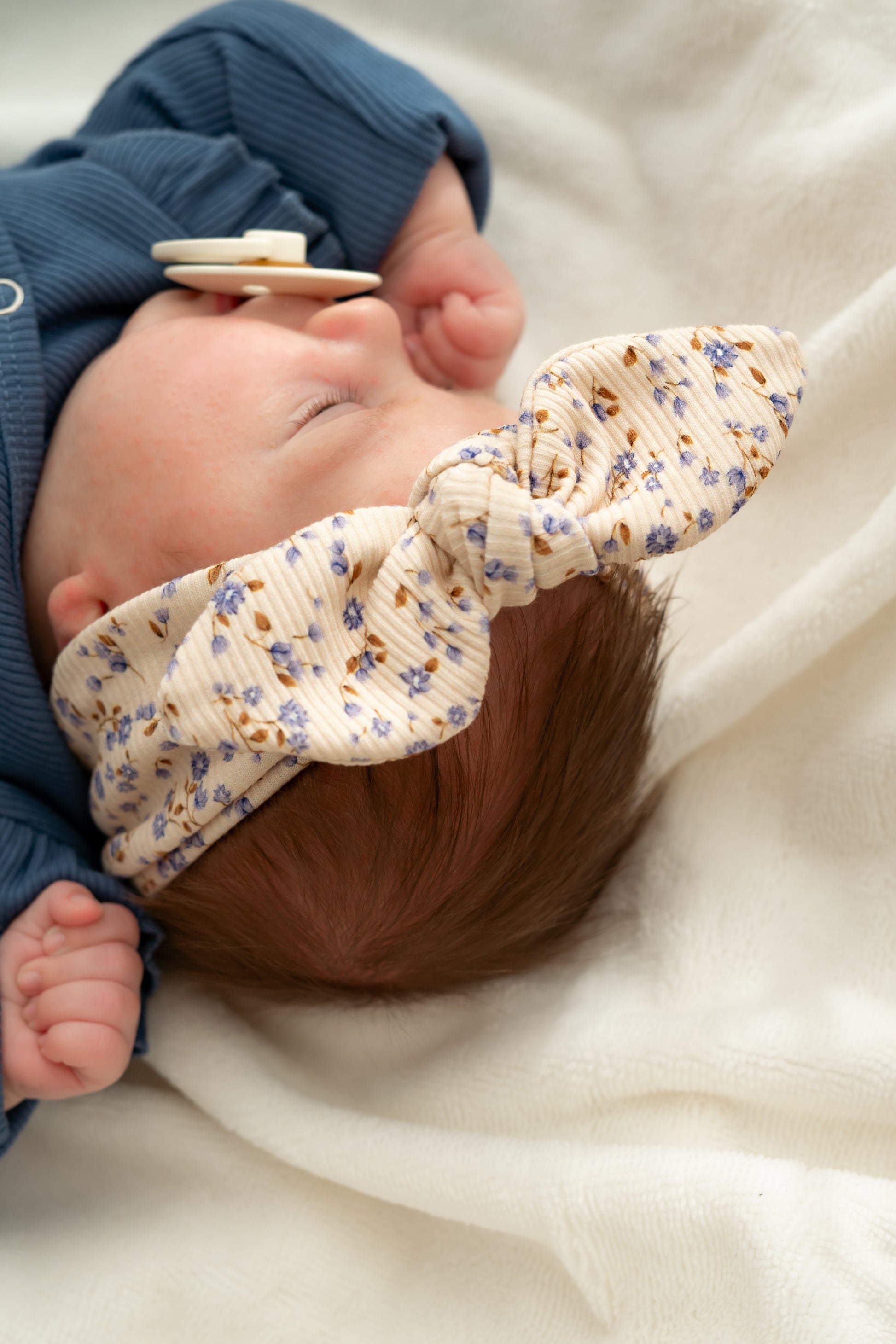 Het babyhaarbandje Pastel Blauw Mini Bloemen Rib van Heppiejoe is een lief en comfortabel accessoire voor pasgeboren meisjes en peuters. Vervaardigd uit zachte, elastische ribstof in een zachte blauwe tint met verfijnde bloemenprint, voegt dit haarbandje een dromerige en frisse touch toe aan elke outfit.