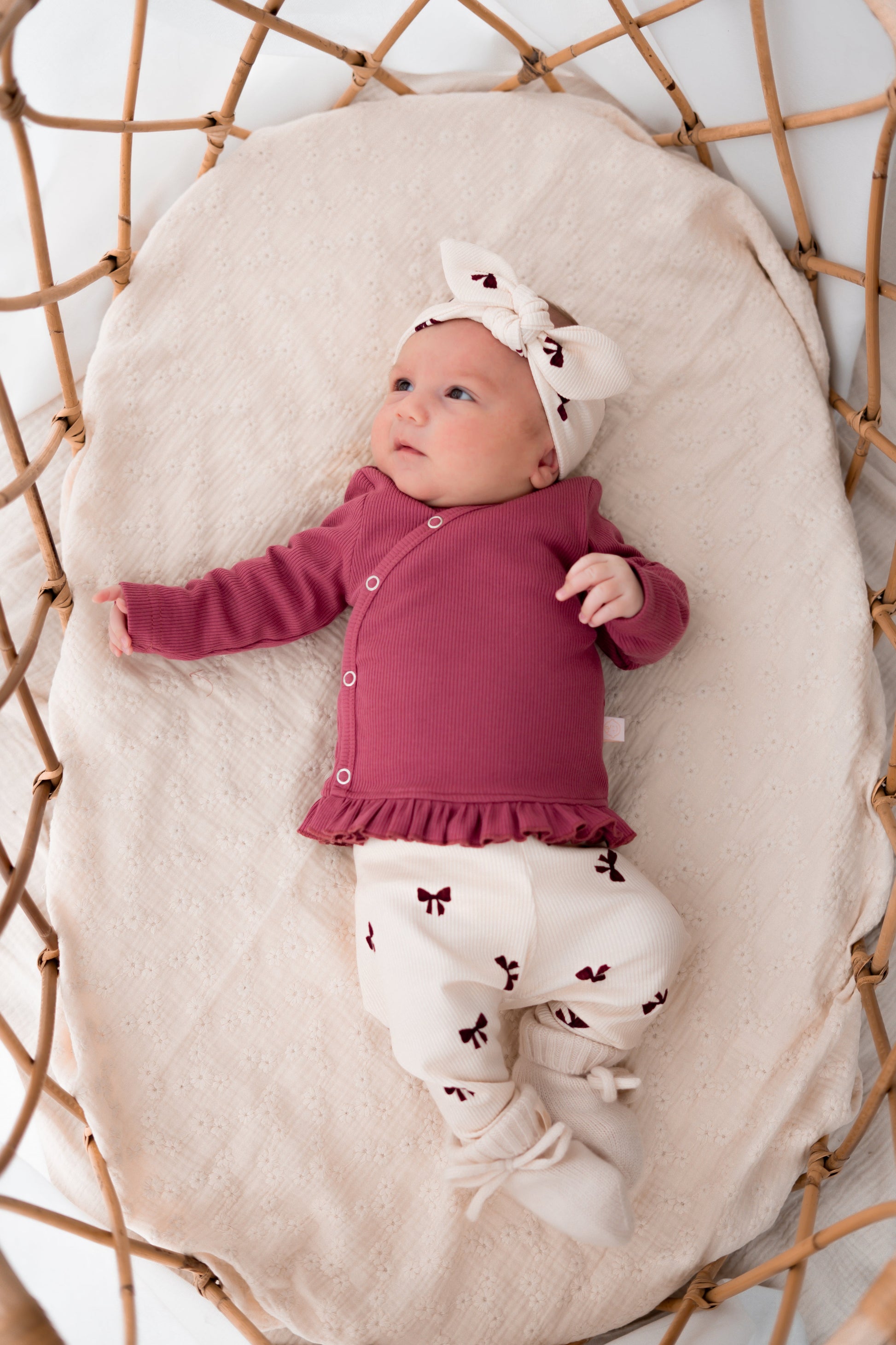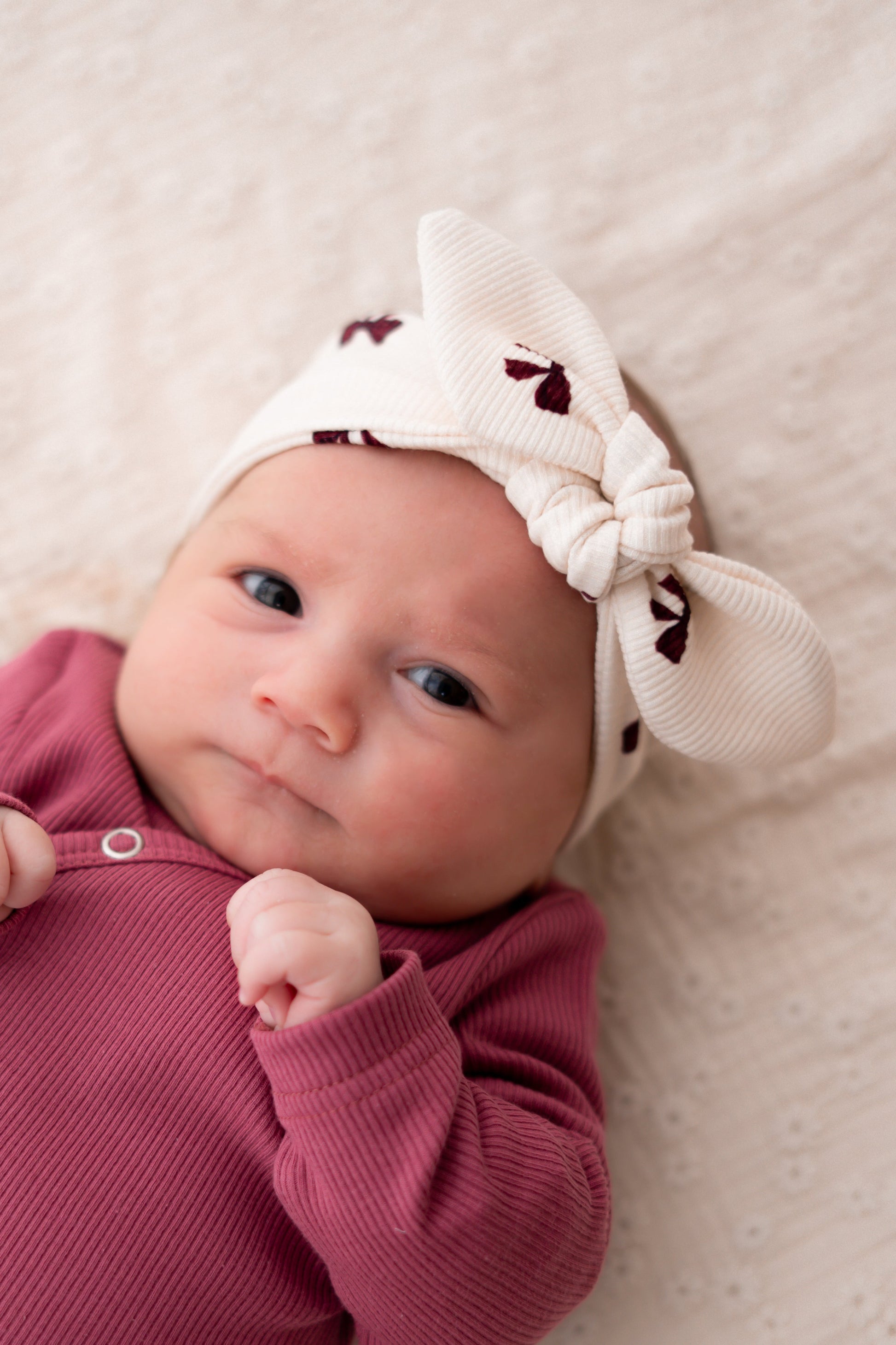 De strik met knoop zorgt ervoor dat het haarbandje eenvoudig op maat te maken is. Geschikt voor pasgeboren baby’s en te dragen terwijl je kleintje groeit.
