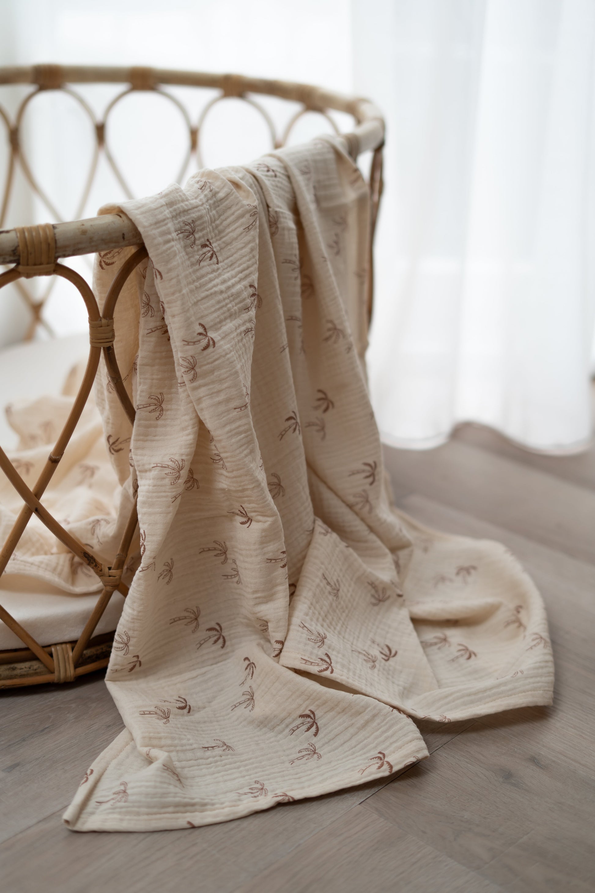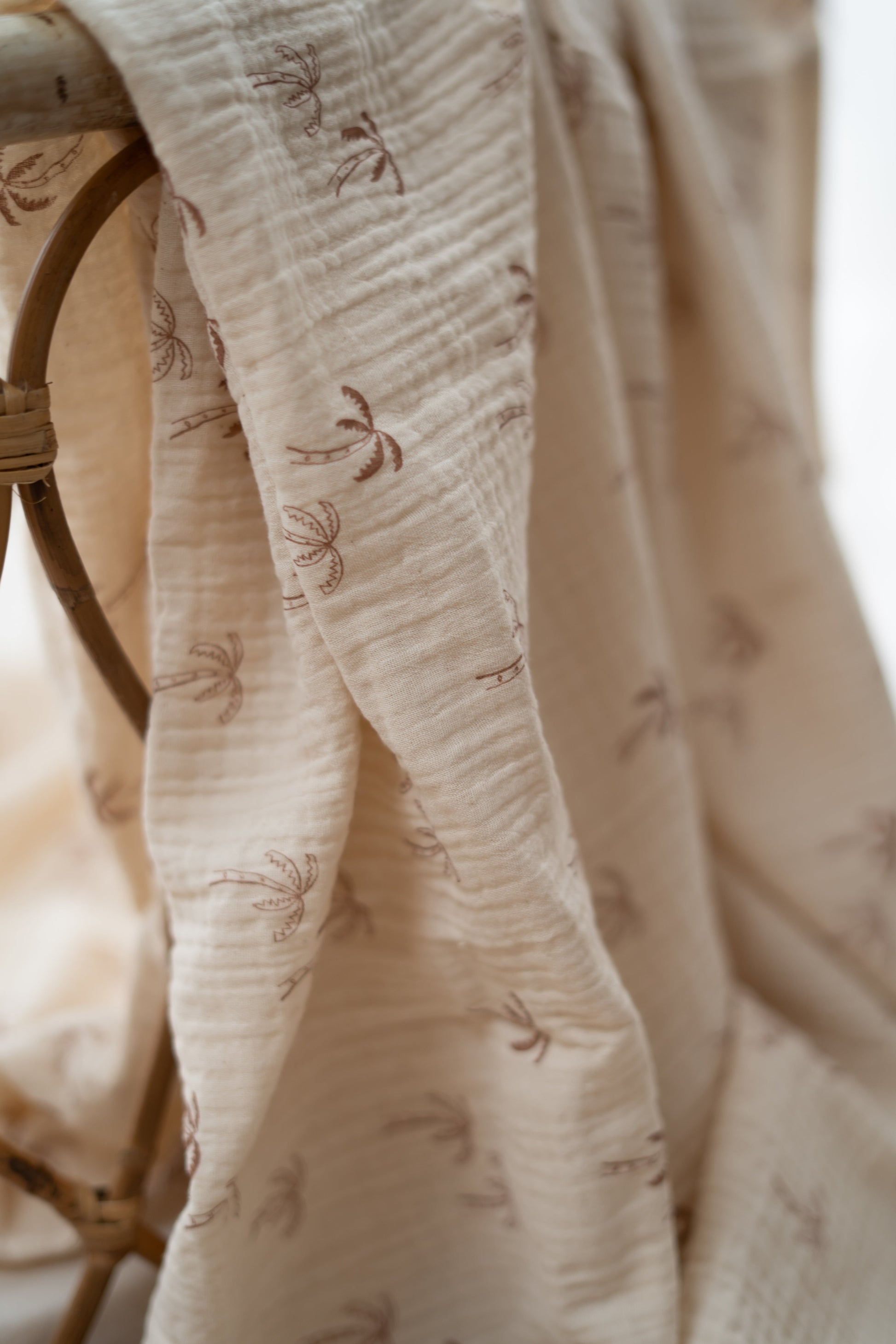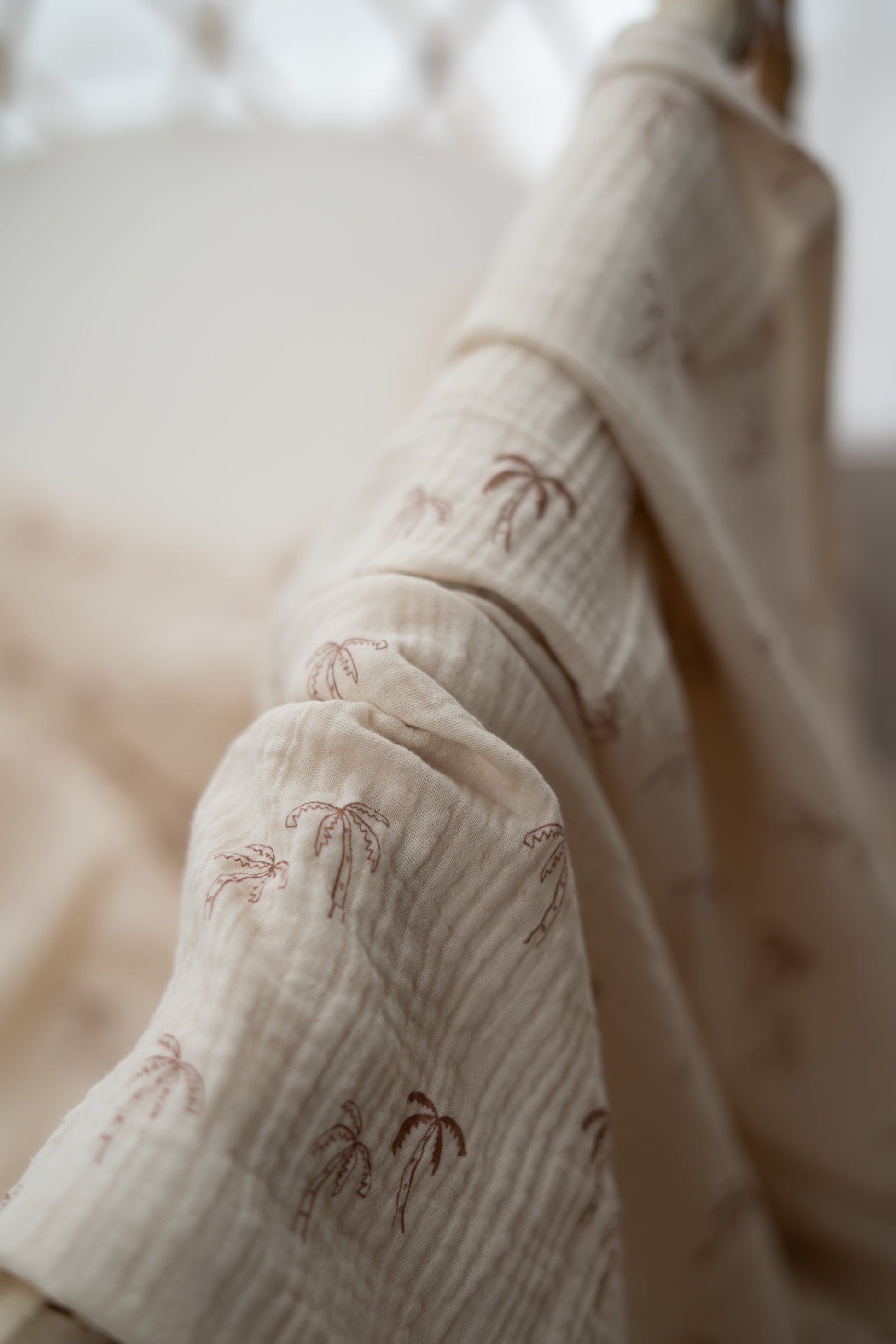 Breng een vleugje natuurlijke rust in de babyuitzet met deze XL hydrofiele doek in zandkleur met een subtiele print van bruine palmbomen. De zachte, ademende hydrofielstof van 100% katoen zorgt voor maximaal comfort voor jouw kleintje. Met een royaal formaat van ca. 120x130 cm is deze doek multifunctioneel inzetbaar – ideaal voor thuis én onderweg.