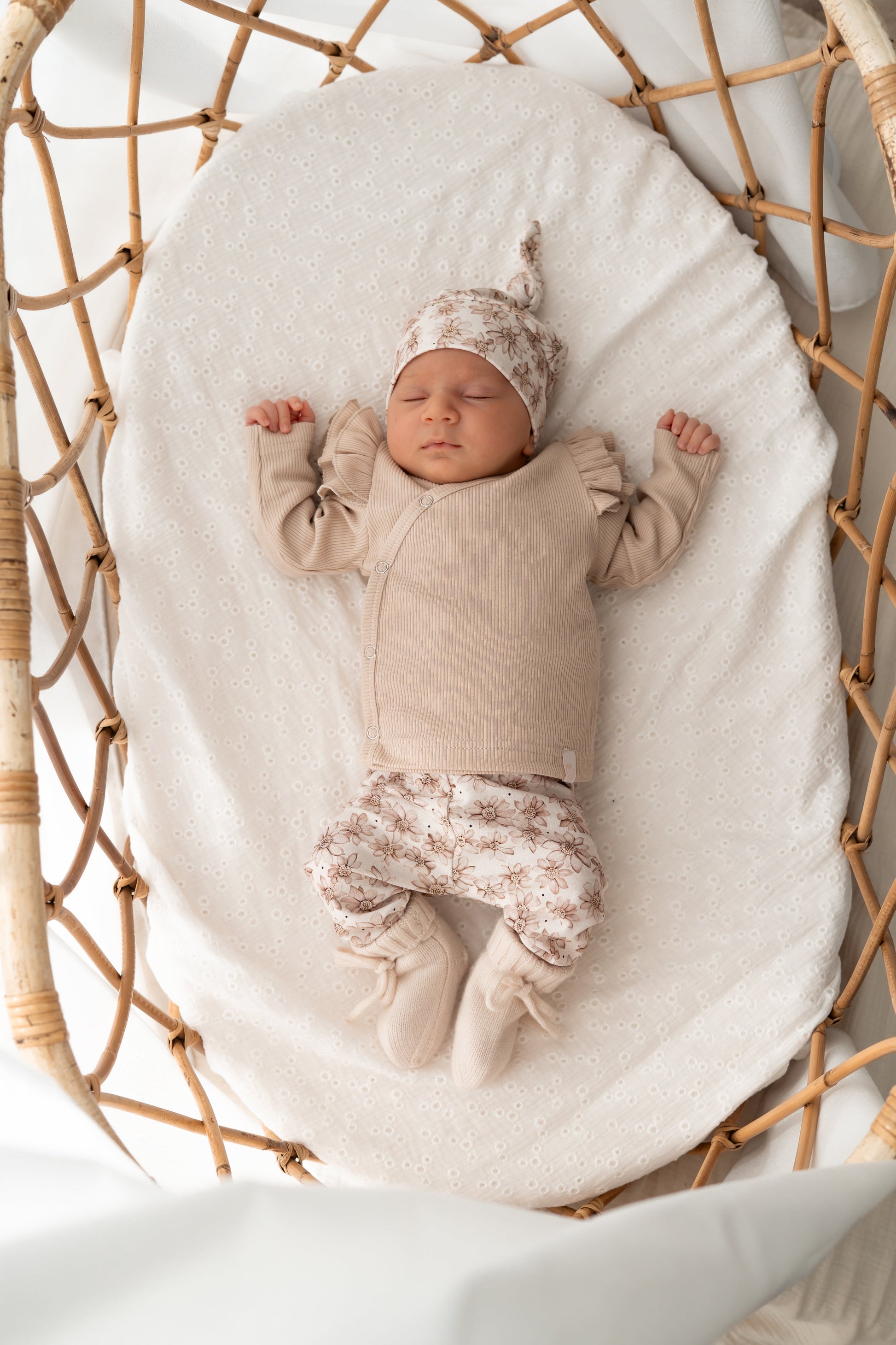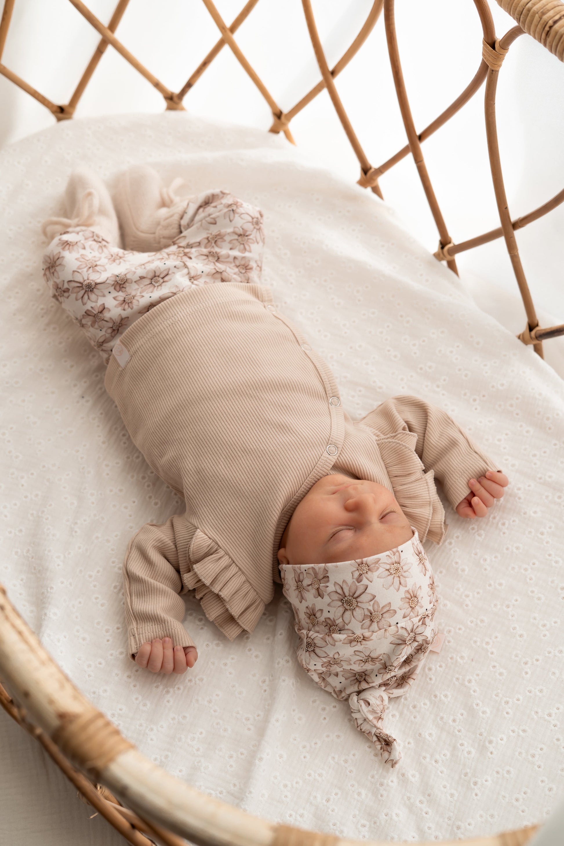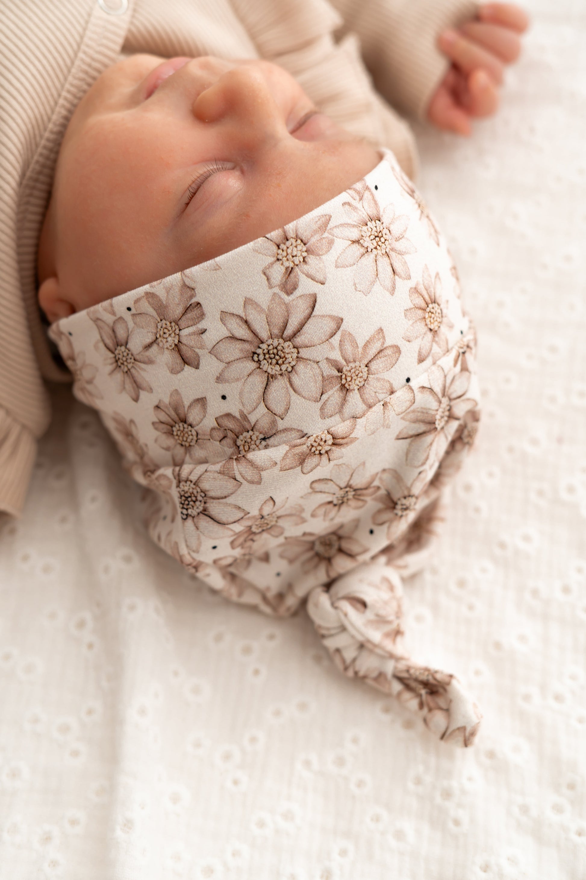 Babymutsje met beige bloemen – Zacht, verstelbaar en stijlvol