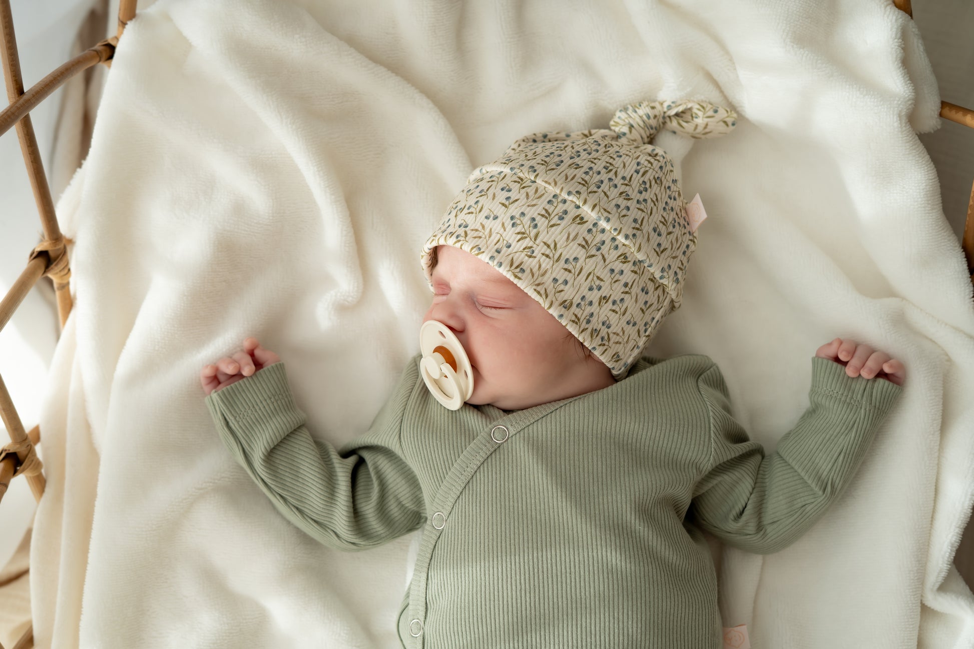 Verstelbare knoop: Past zich eenvoudig aan het hoofdje aan – van newborn tot 3 maanden.