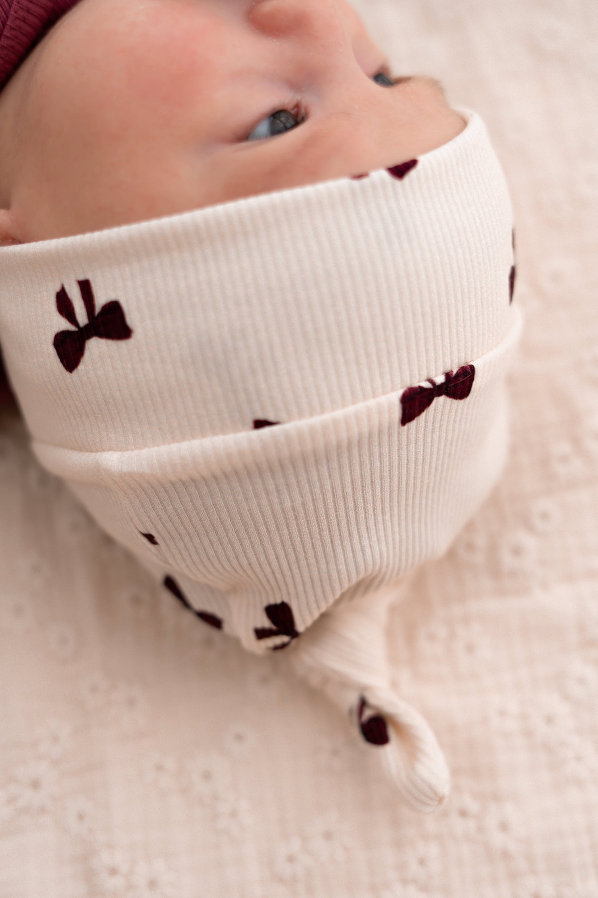 Het rekbare ribmateriaal voelt comfortabel aan op de gevoelige babyhuid en zorgt voor een prettige pasvorm. Dankzij het knoopdetail bovenop blijft het mutsje goed zitten en sluit het mooi aan rond het hoofdje van je baby. Ideaal voor de eerste dagen na de geboorte, maar ook perfect voor dagelijks gebruik.