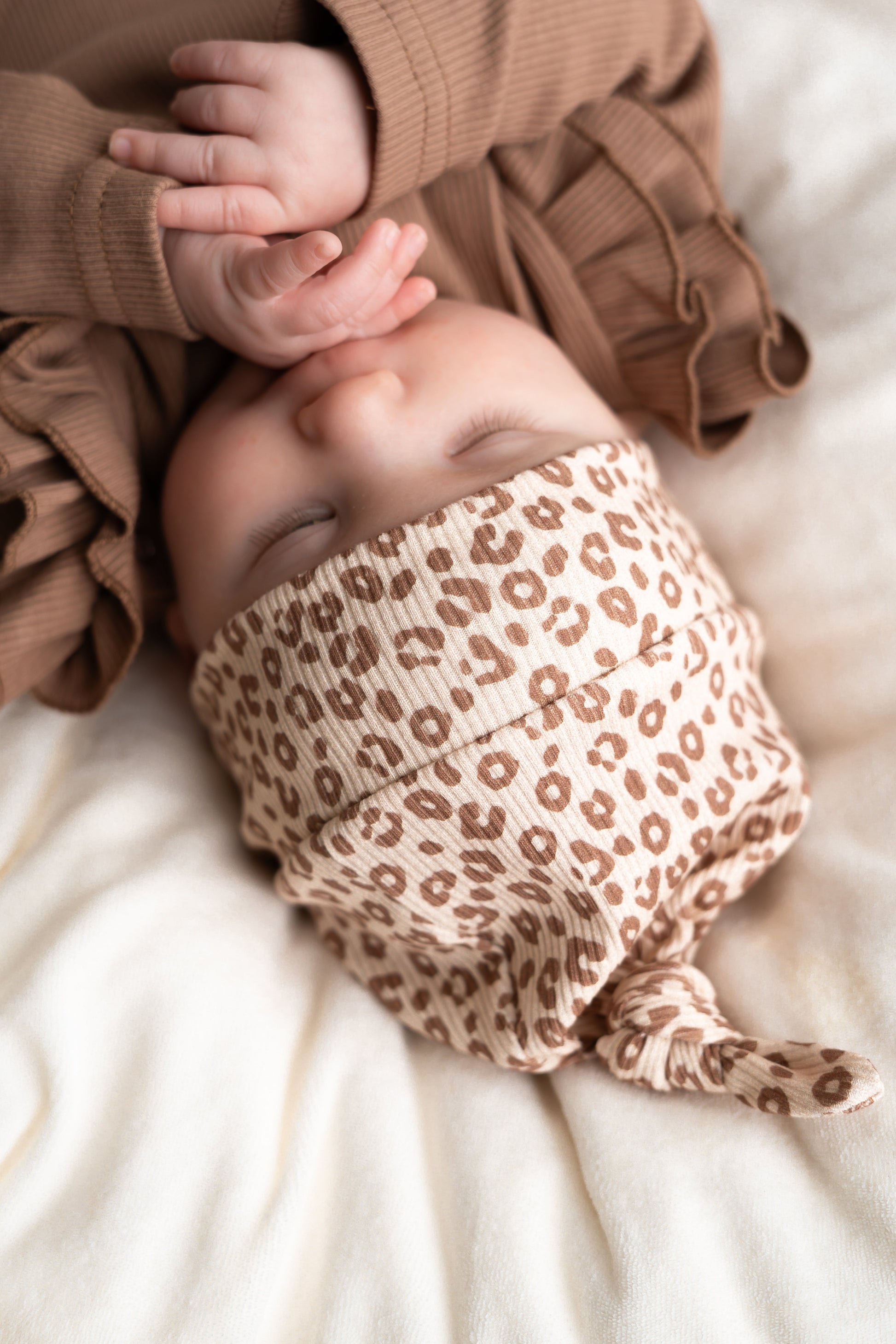 - Het newborn setje met panterprint in cacao rib bestaat uit 1x een broekje (maat 50/56) en 1x een bijpassend mutsje (0-3 maanden), perfect als eerste outfit voor je kleintje.