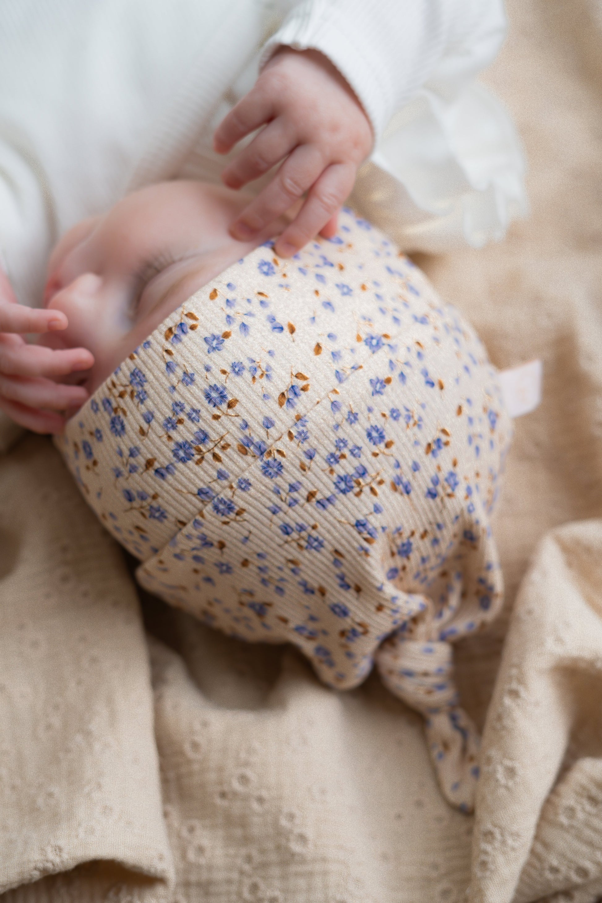 Geef je pasgeboren baby een liefdevolle start met dit dromerige newbornsetje van zachte ribstof, versierd met fijne pastelblauwe bloemetjes op een crème ondergrond. Een perfecte combinatie van comfort en zachtheid – ideaal voor de eerste dagen.