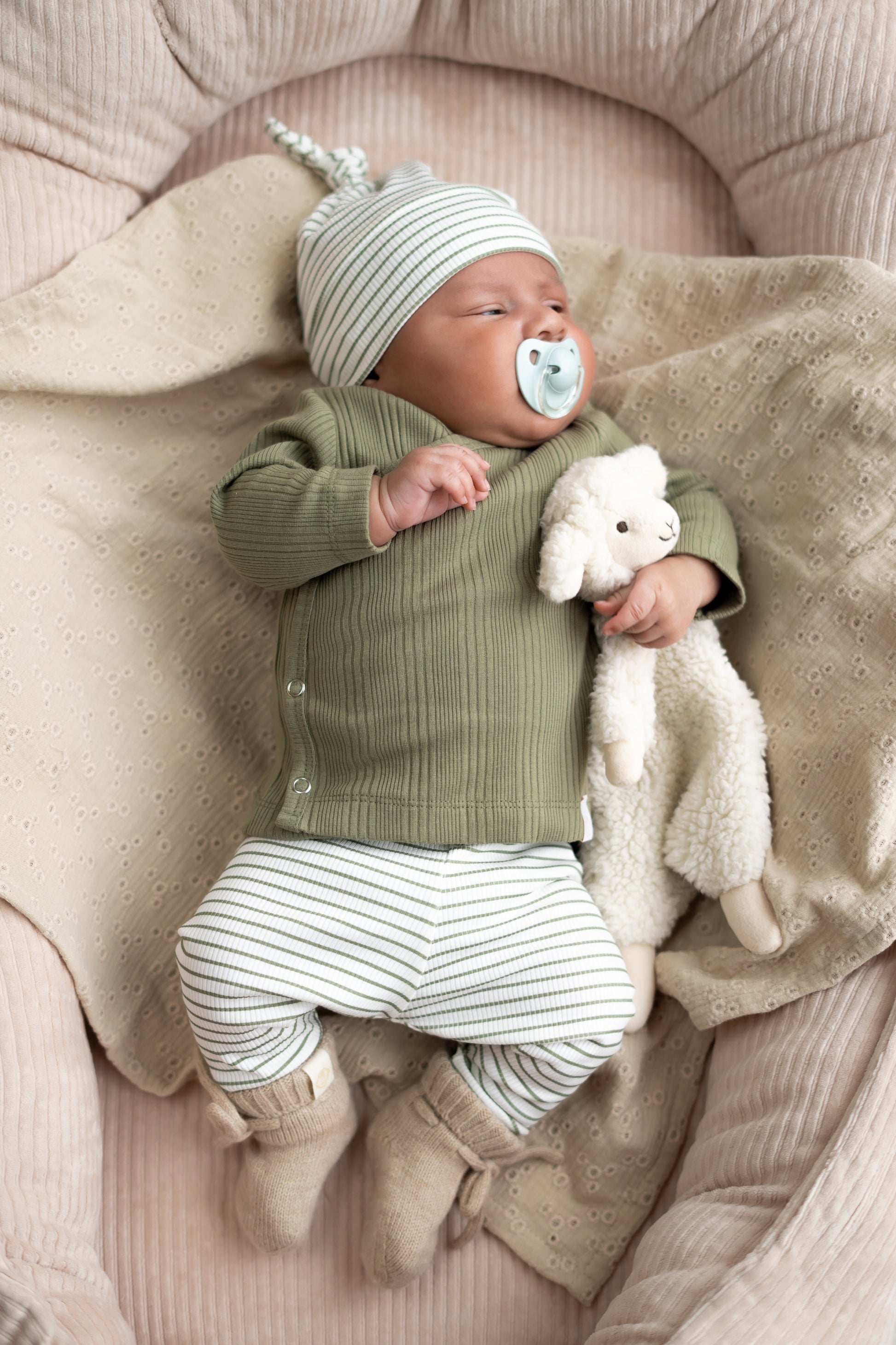 Bestel het newborn setje Streepjes Groen in ribstof vandaag nog en geef je kleintje een outfit die past bij de mooiste eerste momenten.