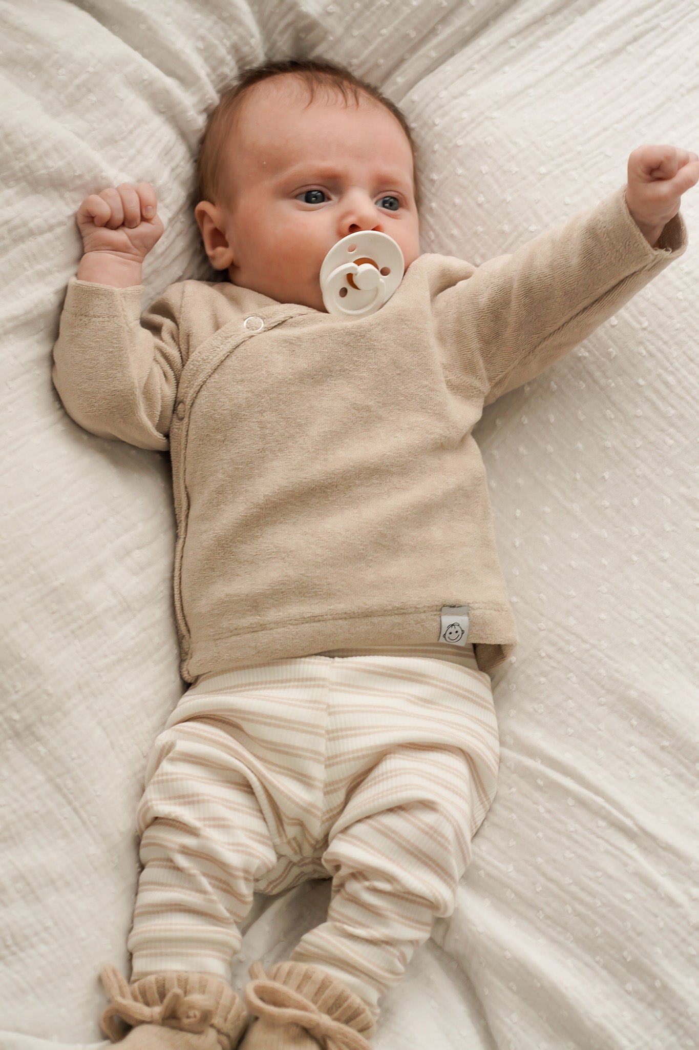 Ontdek ons elegante overslagshirtje in beige, voorzien van praktische drukknoopjes en gemaakt van zachte badstof voor ultiem comfort. De subtiele textuur van de badstof geeft een speels en tijdloos karakter aan dit stijlvolle shirtje.