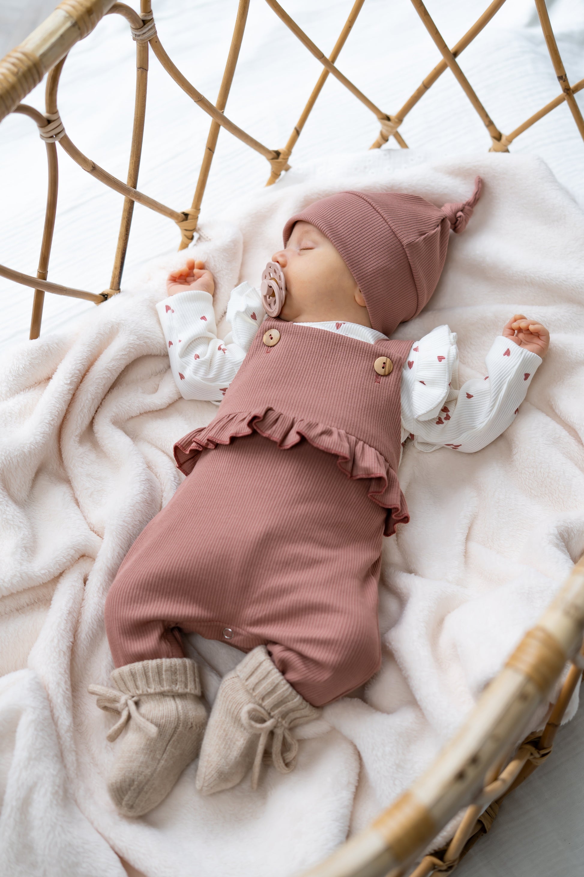 Dit tuinbroekje met ruffles in klei roze is perfect voor de eerste fotoshoots, kraambezoek of als dagelijkse babyoutfit. Een onmisbare toevoeging aan je babymeisjes kledingcollectie!