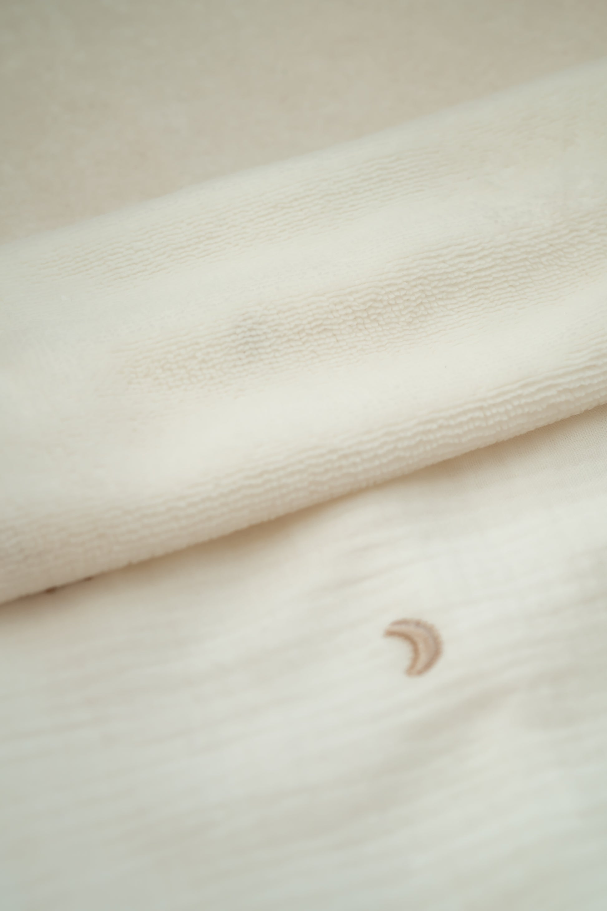 Het neutrale ecru, verrijkt met zacht beige borduurwerk van sterren en maantjes, straalt rust en verfijning uit. Past moeiteloos bij elk interieur.